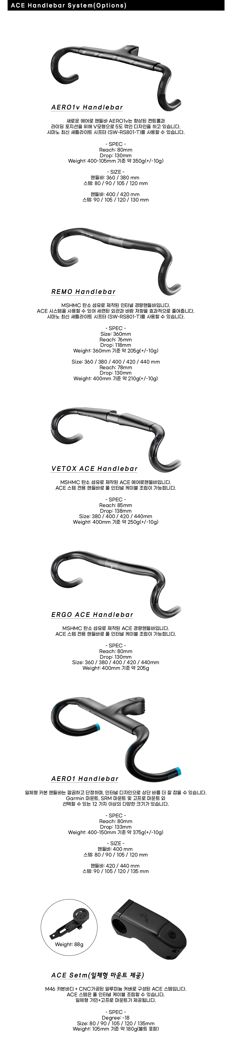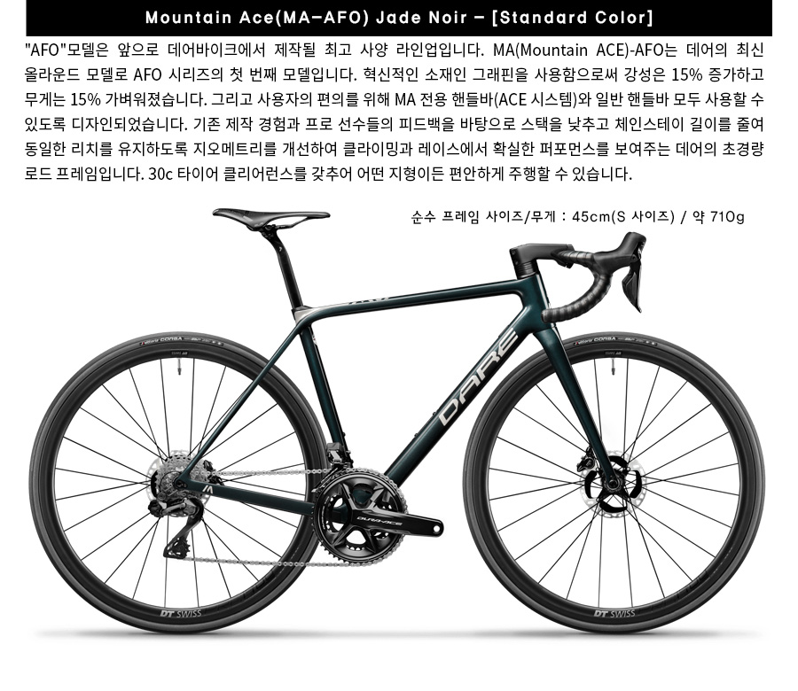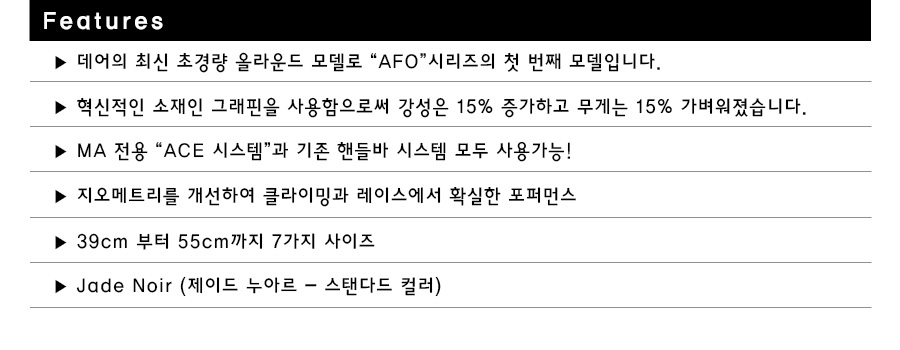 "AFO"모델은 앞으로 데어바이크에서 제작될 최고 사양 라인업입니다. MA(Mountain ACE)-AFO는 데어의 최신 올라운드 모델로 AFO 시리즈의 첫 번째 모델입니다. 혁신적인 소재인 그래핀을 사용함으로써 강성은 15% 증가하고 무게는 15% 가벼워졌습니다. 그리고 사용자의 편의를 위해 MA 전용 핸들바(ACE 시스템)와 일반 핸들바 모두 사용할 수 있도록 디자인되었습니다. 기존 제작 경험과 프로 선수들의 피드백을 바탕으로 스택을 낮춤